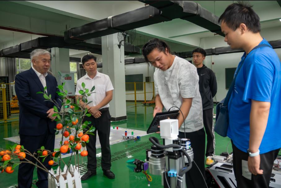 當天上午11時,陳學(xué)庚一行來到我校機械工程學(xué)院調(diào)研指導(dǎo),實地考察了學(xué)院在丘陵山地農(nóng)機裝備、機甲機器人及農(nóng)機材料等方面的教學(xué)與科研成果,并與師生代表進行交流。陳學(xué)庚對學(xué)院在本科生創(chuàng)新能力培養(yǎng)方面取得的成效表示肯定,表示“同學(xué)們動手能力強,在本科階段就能取得這樣的成果實屬不易”。他建議學(xué)院進一步深化產(chǎn)教融合,主動對接企業(yè)需求,推動科研成果轉(zhuǎn)化,培養(yǎng)更多適應(yīng)區(qū)域經(jīng)濟社會發(fā)展的高素質(zhì)應(yīng)用型人才。