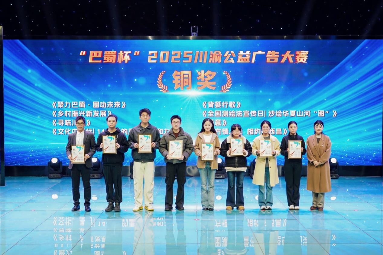 11月28日,“巴蜀杯”2025川渝公益廣告大賽頒獎(jiǎng)儀式在重慶市永川區(qū)融媒體中心圓滿落幕。傳媒學(xué)院2022級(jí)廣告學(xué)專(zhuān)業(yè)肖瀟同學(xué)所設(shè)計(jì)的平面作品《尋味川渝》榮獲銅獎(jiǎng),張春蕾老師榮獲指導(dǎo)教師獎(jiǎng)。